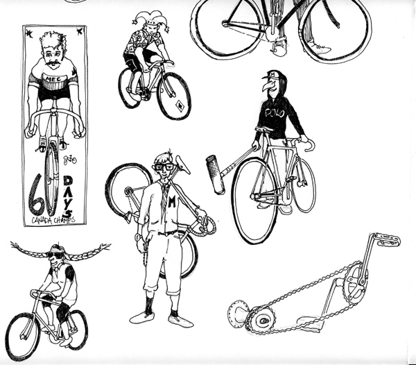 They knew that they wanted it illustrated and they knew my style so it was a great way to start the project off. I left with more ideas than I knew what to do with. I would get to my studio and start the same way I start every project – Sketchbook on one side, world wide web on the other. Ink flew from the pen, it flew from the printer – some of it on paper, and some of it on the floor – it was an exciting time. Some inspiration came from the bike community  – Old and New.